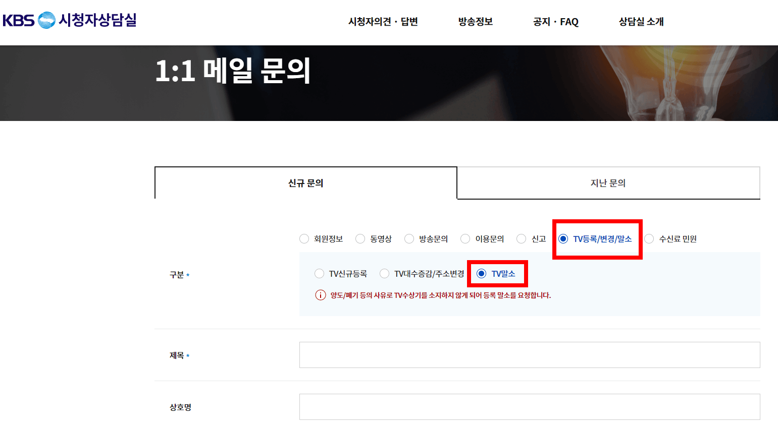 ✔ 입력항목 : 제목, 상호명, 연락처, 수신료 관리번호(전기 고객번호), 주소, 메일주소, 첨부파일, 내용